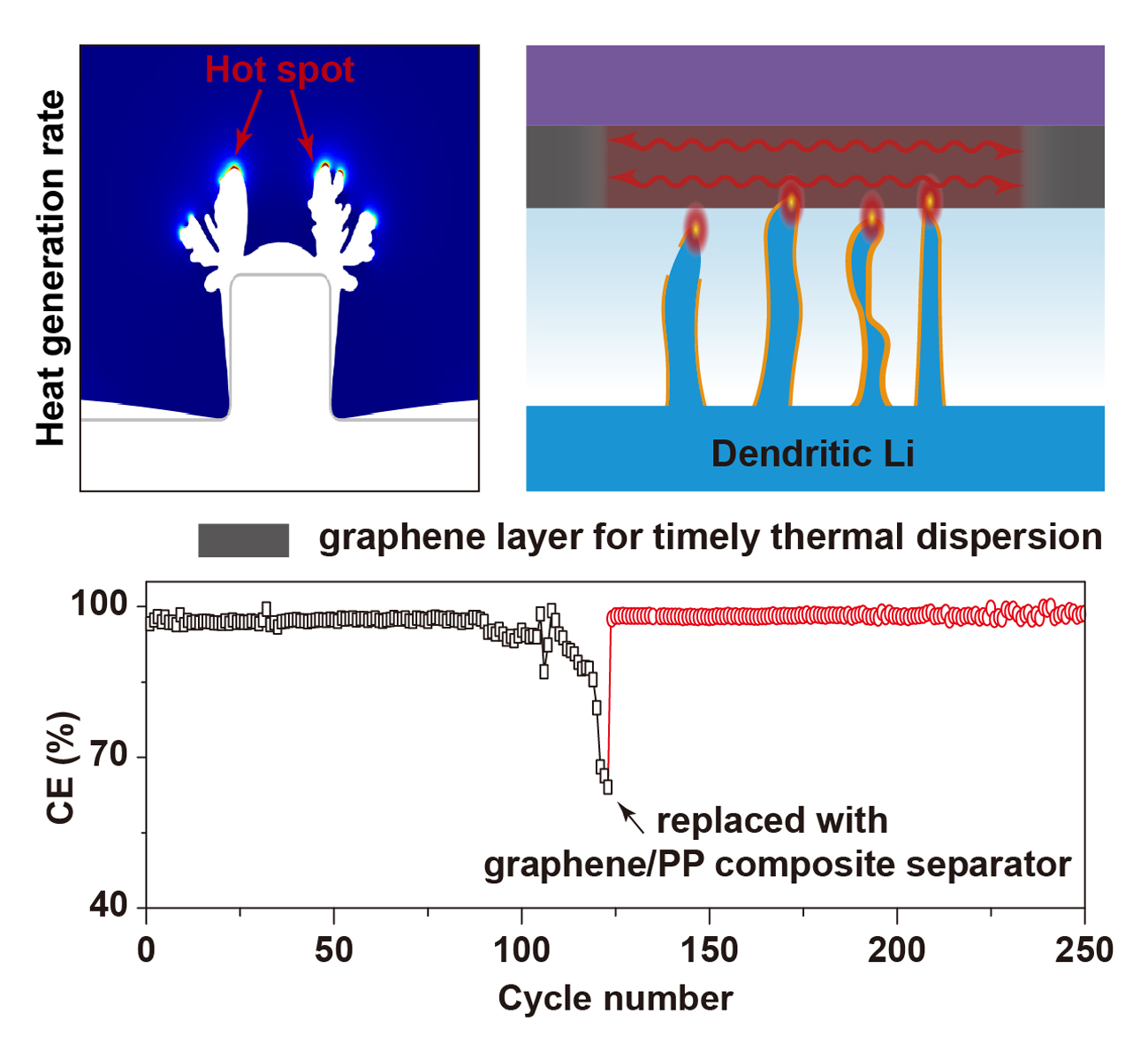 研究人员建立了传热-电化学沉积耦合模型,考察了不同沉积电流和过电位下锂沉积系统发热功率的时空演化以及温度和锂离子分布。模型结果表明锂枝晶尖端不可避免的存在局部温度热点,而热点的存在加剧了不均匀的局部锂沉积,进一步促进了锂枝晶的生长。通过引入高导热石墨烯片层包覆隔膜作为原位热扩散媒介及时消除局部温度热点可有效抑制枝晶生长、“恢复”循环后的不理想锂沉积,实现均匀致密的锂沉积形貌和电池高效稳定循环。