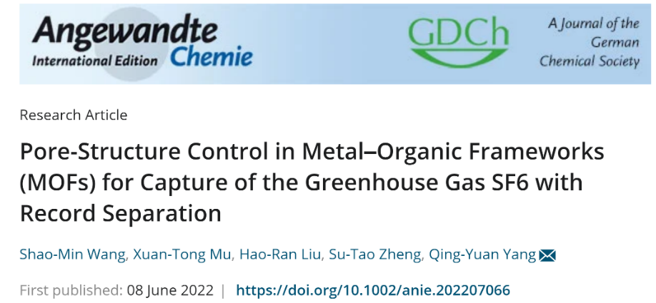 相关成果以“金属-有机框架(MOFs)的孔结构调控用于捕获温室气体SF6并具有创记录的分离比”(Pore-Structure Control in Metal–Organic Frameworks (MOFs) for Capture of the Greenhouse Gas SF6 with Record Separation)为题发表在《德国应用化学》(Angew. Chem. Int. Ed.)上,并被选为热点论文(Hot paper)。该研究工作由91探花