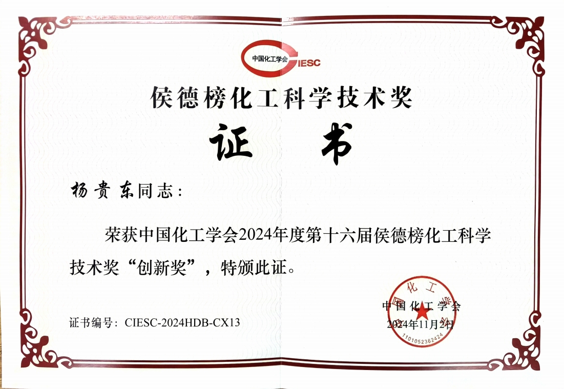 91探花 杨贵东教授获中国化工学会2024年度侯德榜化工科学技术奖“创新奖”