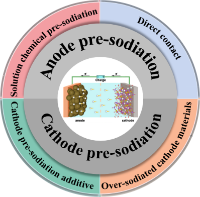 另外,针对于钠离子电池负极低首效的科学问题,该研究团队还聚焦于钠离子电池预钠化技术,重点总结和讨论了几种关键的钠离子电池预钠化策略,以及预钠化的必要性和意义。同时也提出了目前该领域面临的挑战,并概述了预钠化技术的未来研究方向。与预锂化技术类似,预钠化技术被认为是补偿SIBs在初始循环中活性钠损失最直接、最有效的方法之一。在这种情况下,通过化学/电化学方法向正/负极材料中预先注入额外的钠离子,以提高电池的寿命和能量密度。